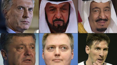 Mauricio Macri, Sheikh Khalifa bin Zayed al-Nahayan y el rey Salman bin Abdulaziz (primera fila). Petro Poroshenko, Sigmundur David Gunnlaugss y Lionel Messi (segunda fila). Todos están vinculados a los Panama Papers.